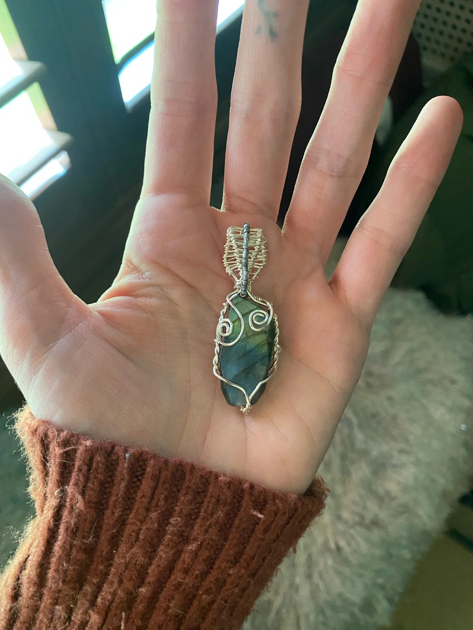 This beautiful pendant is made with silver wire and a beautiful piece of Labradorite and some tiny beads.