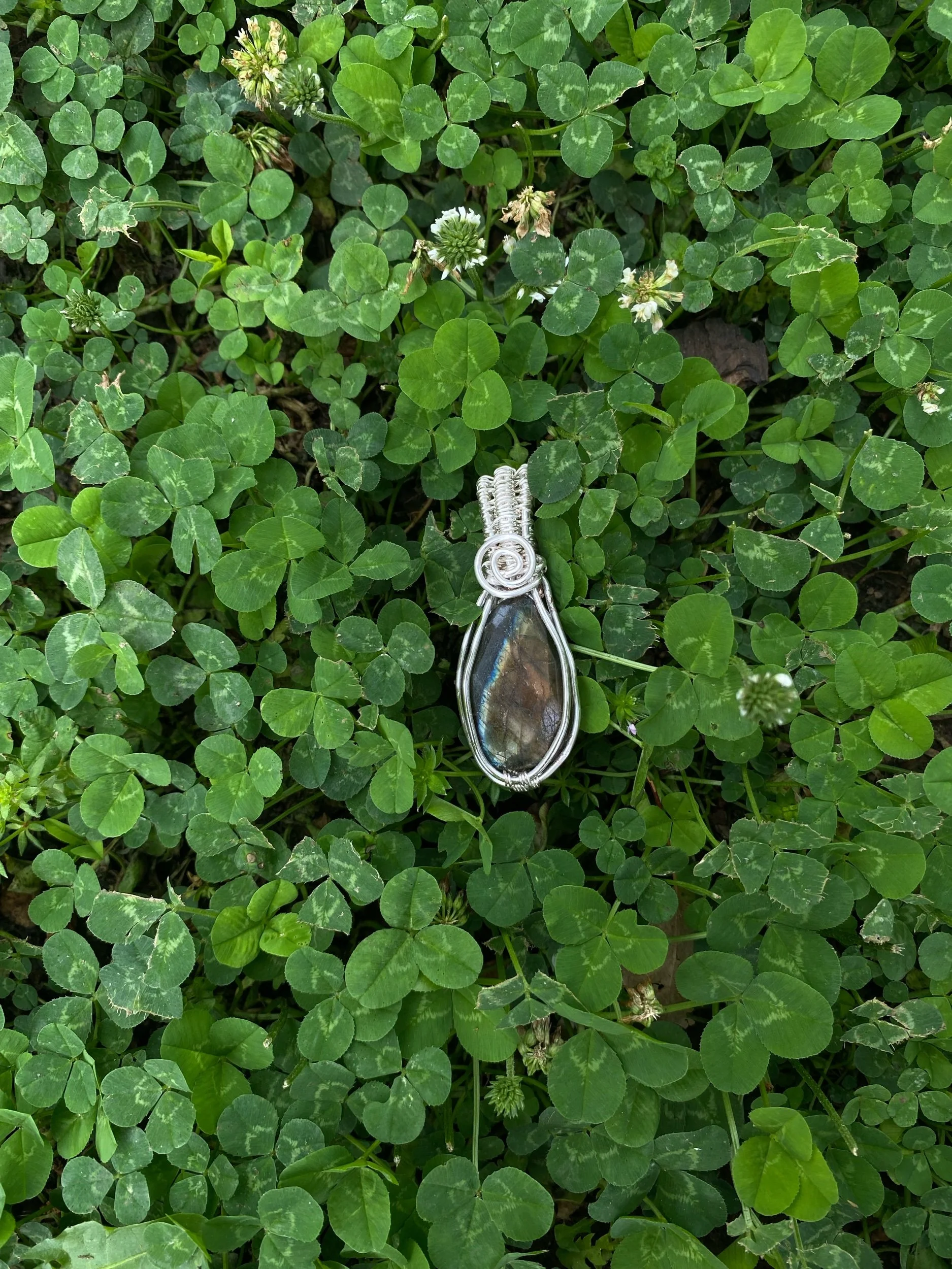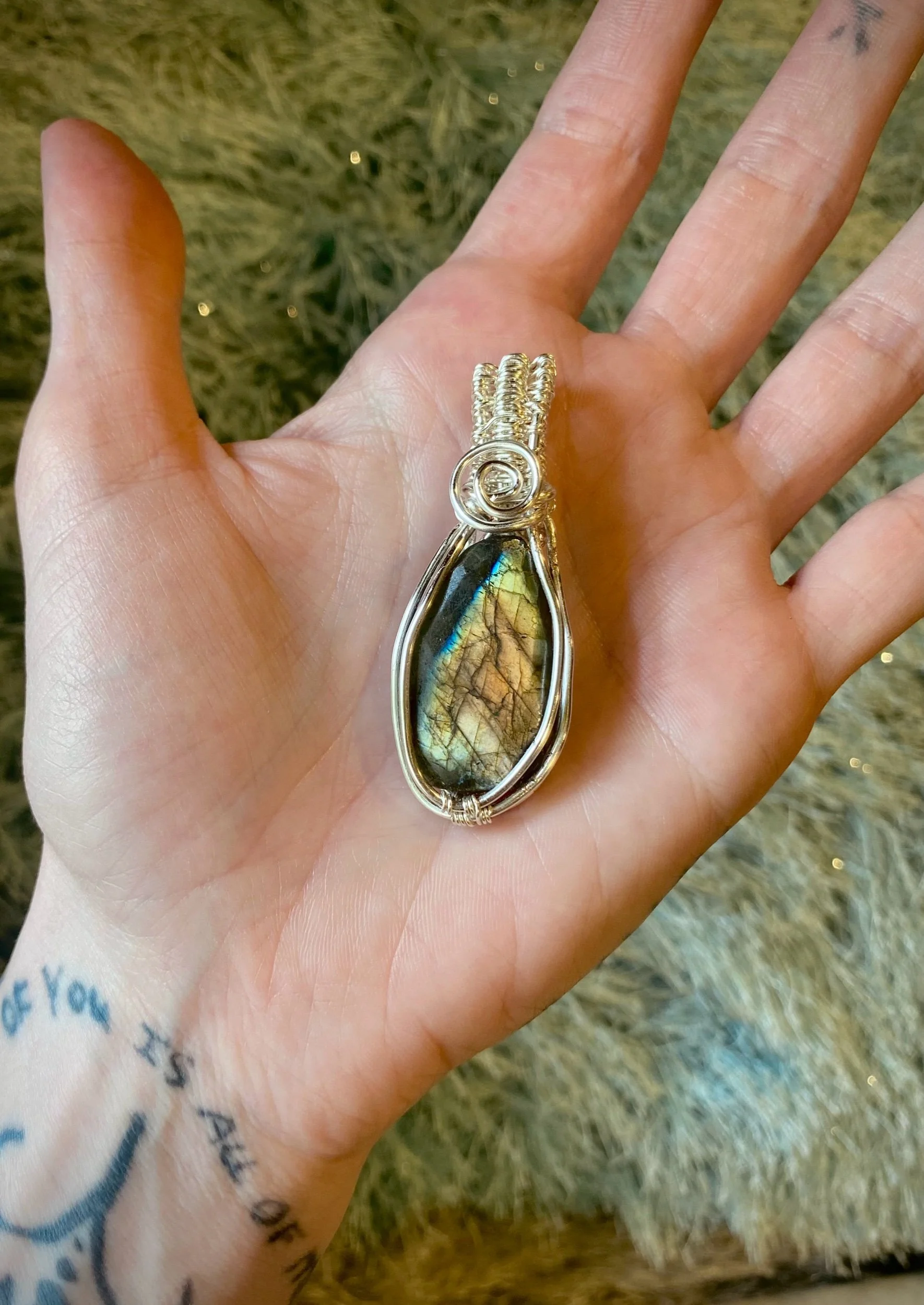 This beautiful Labradorite is wrapped in a shiny silver wire.